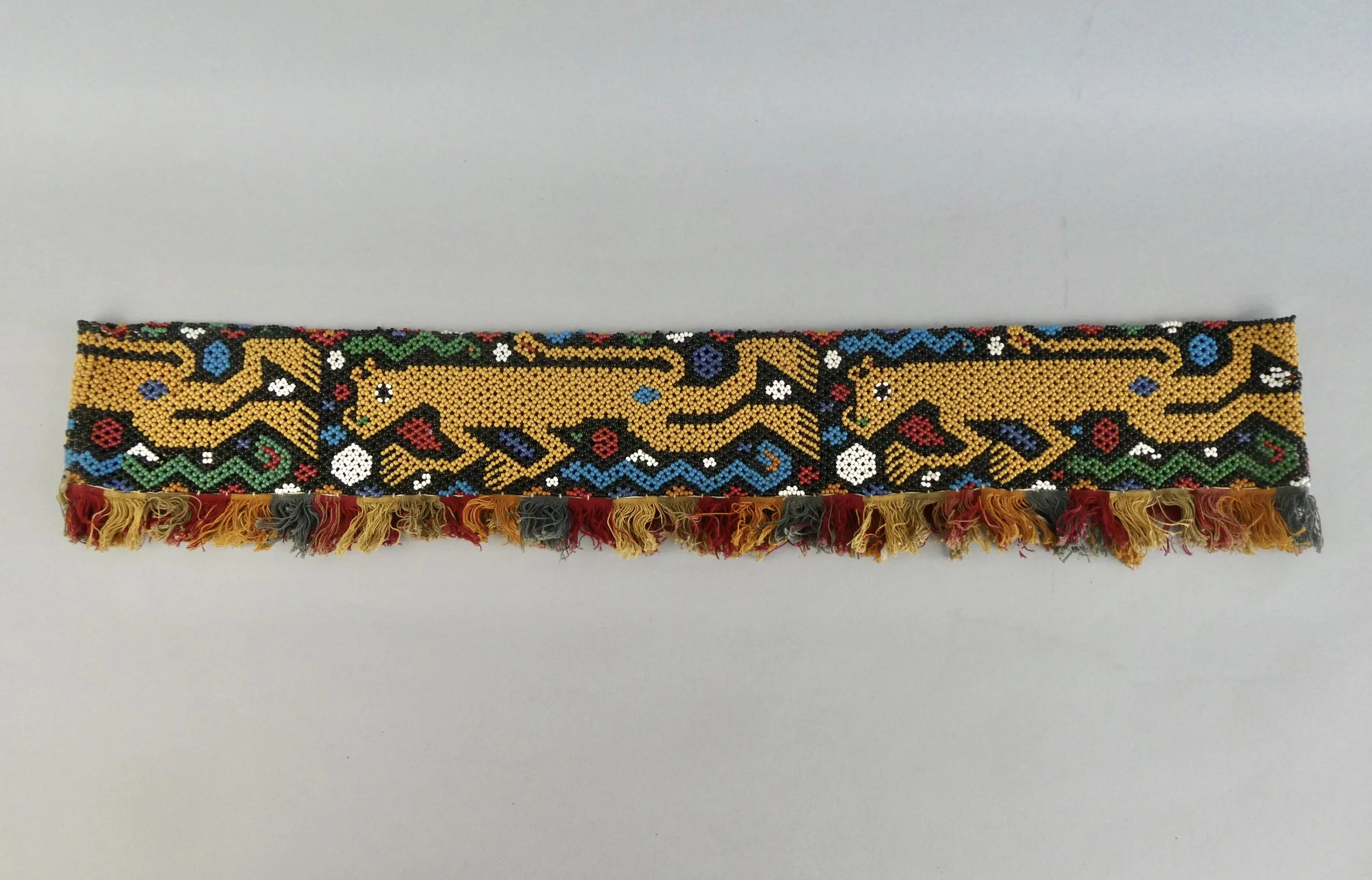 The band features a pattern with animal motifs, ( monkeys? and snakes) a common element in Sumbanese design. These motifs are often linked to local beliefs and traditions. The beadwork shows careful craftsmanship and balanced composition.