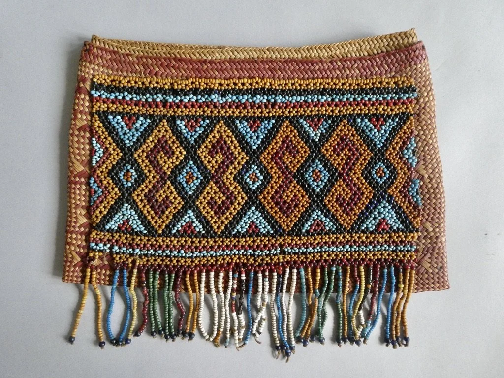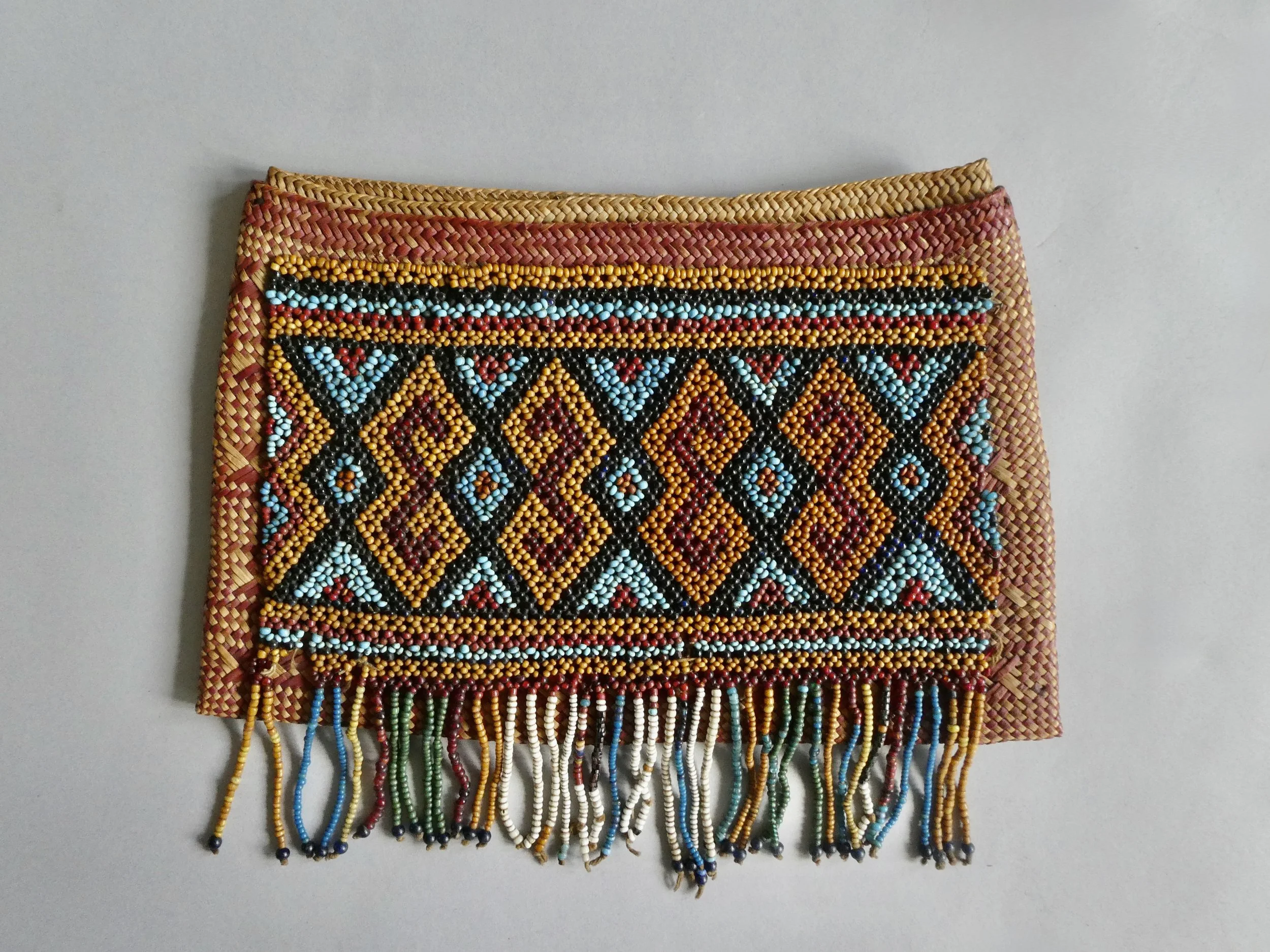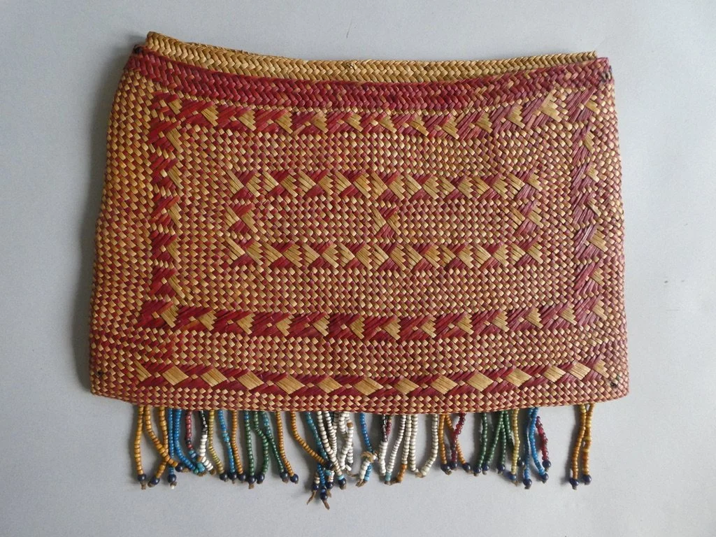 Rare Toraja beaded bag from Sulawesi, Indonesia, c.1900–1930. The bag is woven from Pandanus leaves and adorned with glass beads in the classic Toraja interlocking hook motif. The wickerwork is very nice. Once used to carry betelnut equipment in ritual and social exchange, it remains a striking example of Indonesian tribal art.